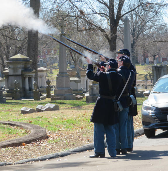 An SVR honor guard commanded by Turner Chris Warren fire a rifle salute as part of the Sherman Remembrance ceremony at Calvary Cemetery in St. Louis, Missouri, on March 8, 2026.