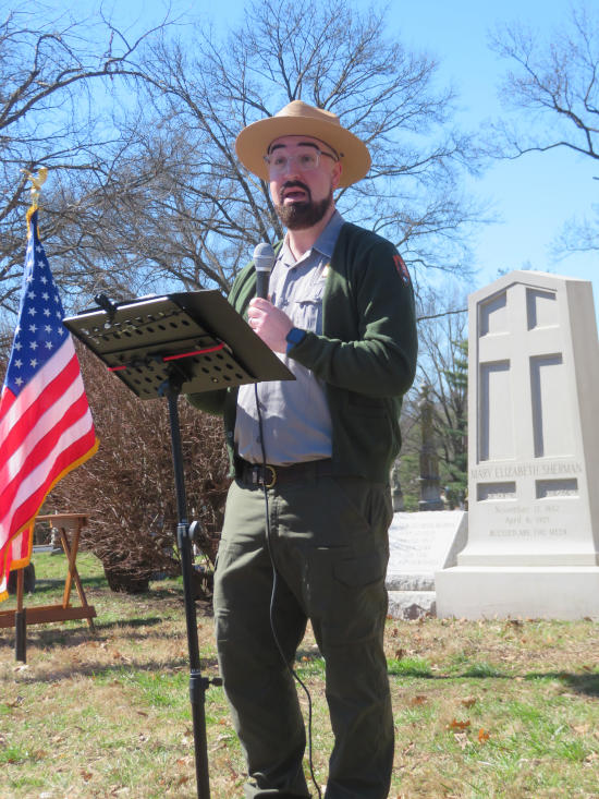 Nick Sacco, Historian at the Ulysses S. Grant National Historic Site, addressed the attendees on William T. Sherman’s St. Louis connections during the Sherman Remembrance ceremony at Calvary Cemetery in St. Louis, Missouri, on March 8, 2026.
